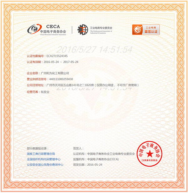 2016年5月,广州和为医药科技有限公司获得CECA(中国电子商务协会)工业电商诚信认证。认证编号:ECA2715524345,标志着和为在工业电商领域的长期诚信经营得到电商协会的正式认可。